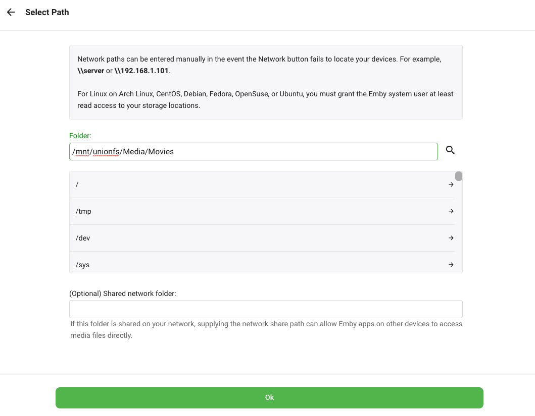 /mnt/unionfs/Media/Movies. Click OK.Note: These paths are for the standard library setup. If you have customized it, use those paths instead.