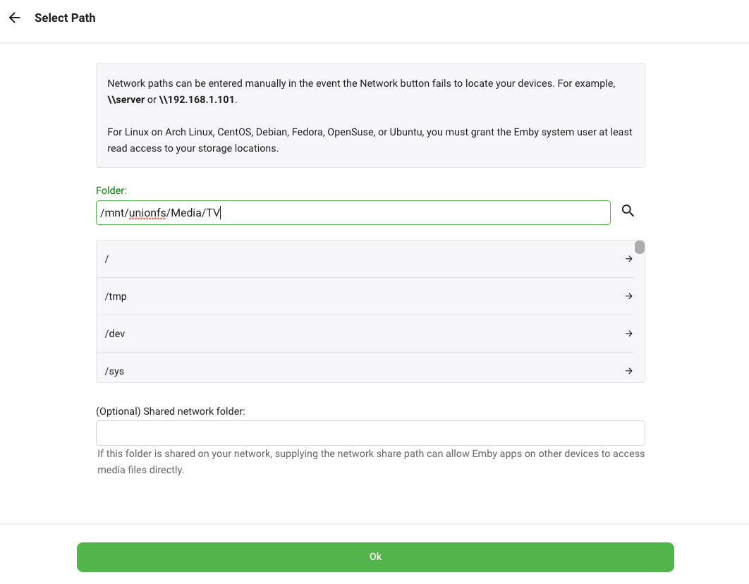 /mnt/unionfs/Media/TV. Click OK.Note: These paths are for the standard library setup. If you have customized it, use those paths instead.
