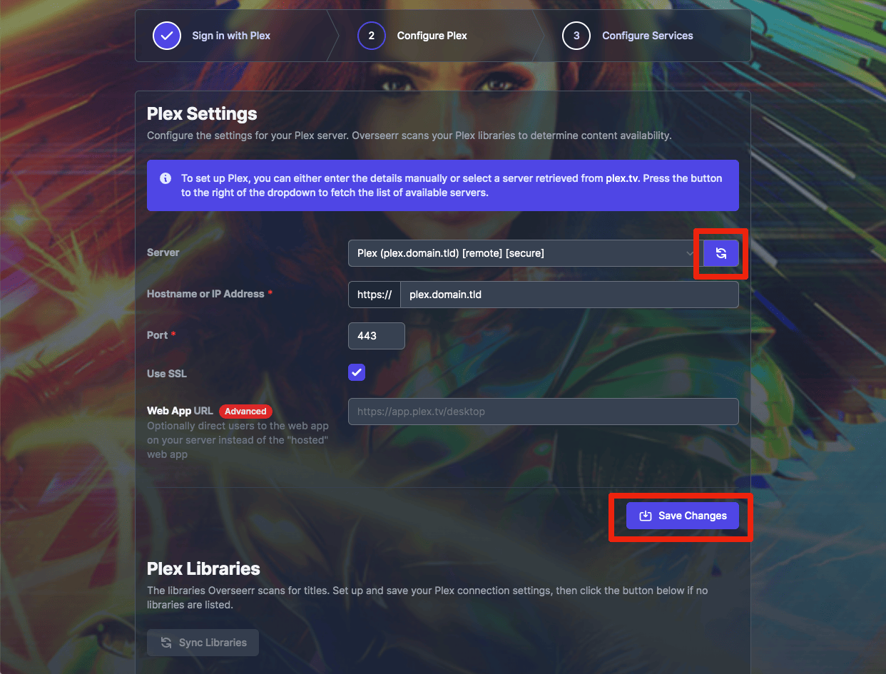 - Click the "refresh" icon, then select your Plex server from the dropdown. Click "Save Changes" to retrieve the libraries from Plex.