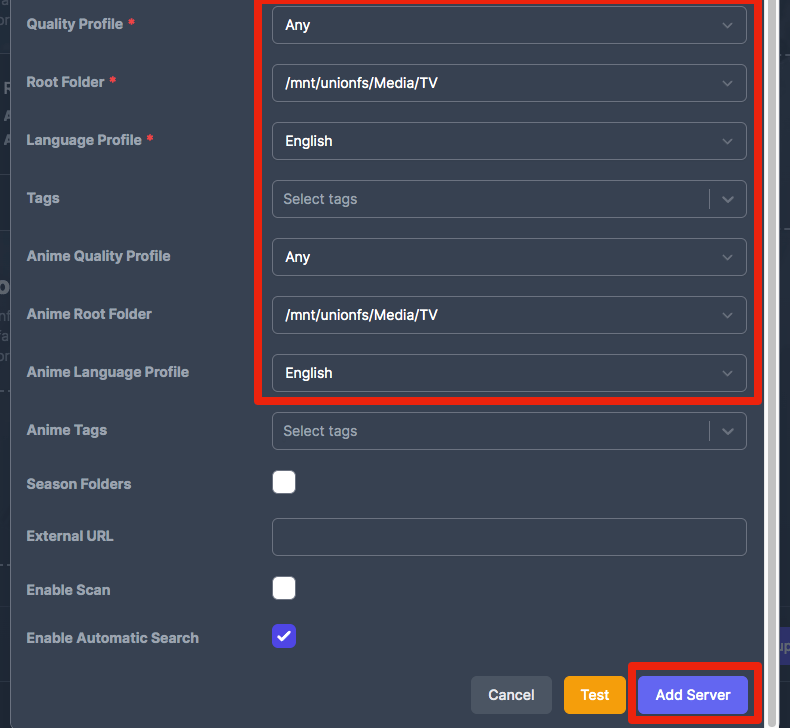 - Scroll down and click "Test" to connect to Sonarr and retrieve Quality Profiles, etc.