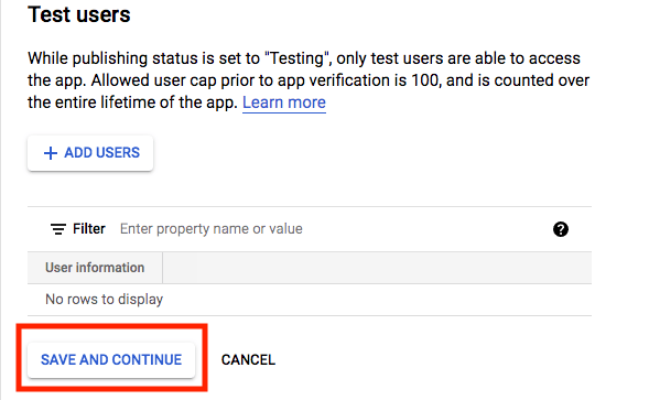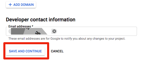 Click "SAVE AND CONTINUE" on the scopes screen: